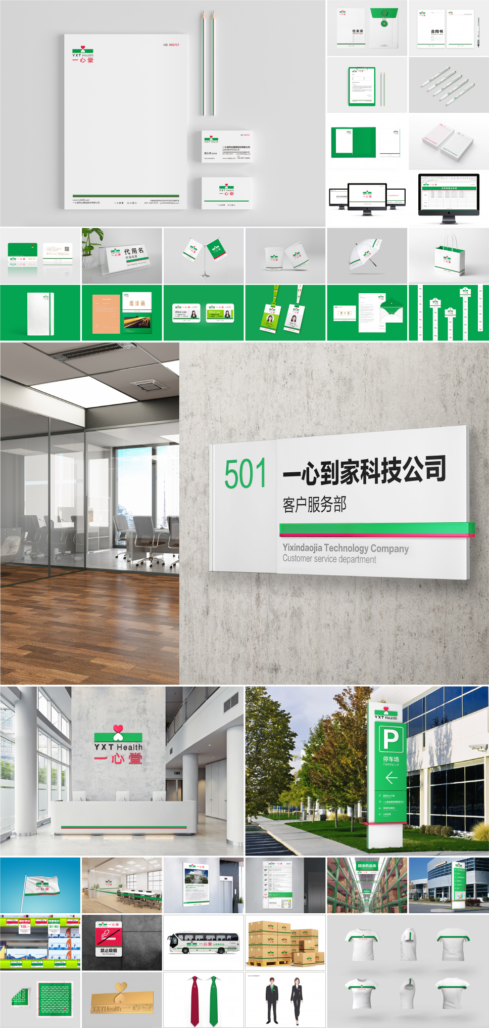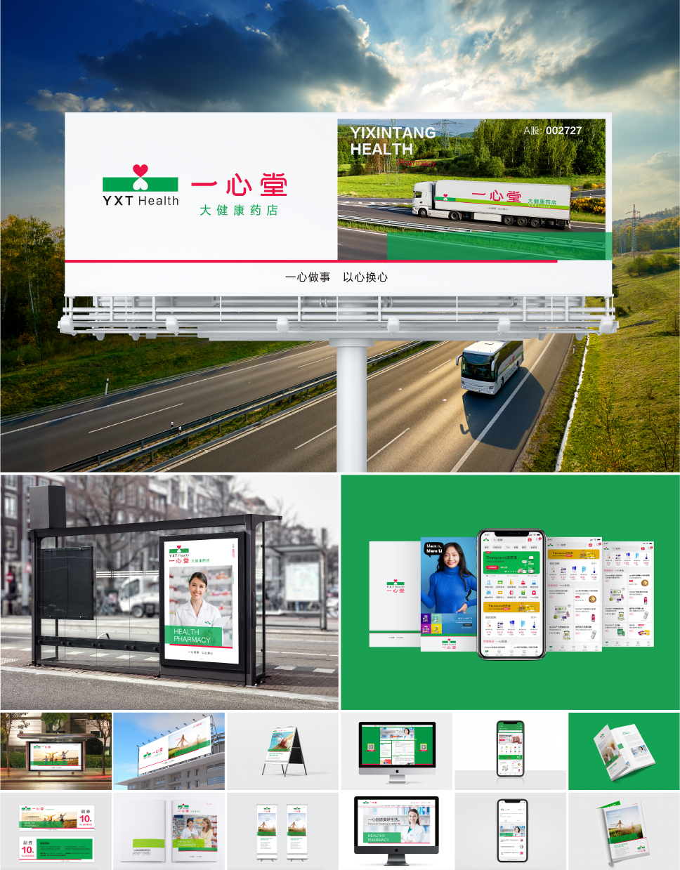 我們為一心堂建立 “一心承載綠色大地”的品牌輔助圖形,紅綠色條始終出現。企業內部使用遵循穩重大氣的原則,在傳播途徑則會更加靈活,體現國際化、年輕化。成為除標志之外,形成品牌資產與企業位置商標的重要戰略元素,為品牌建立差異化,實現有效的價值傳播。