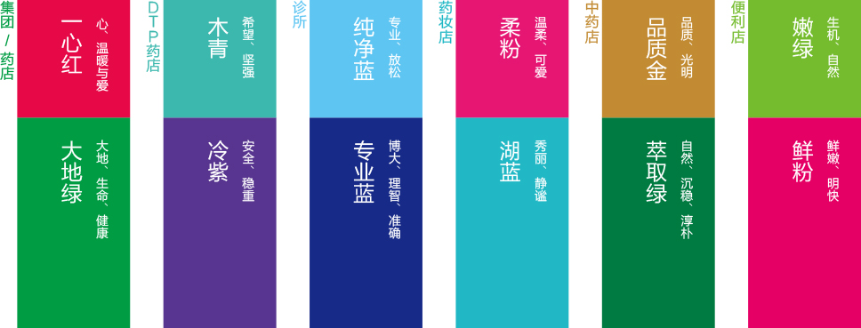 我們通過戰略色彩配置實現一心堂“家族統一,業態獨立”的品牌戰略定位。集團所有業態保持相互協同的同時也要強化空間布局,購買體驗,核心品類策略的設計。