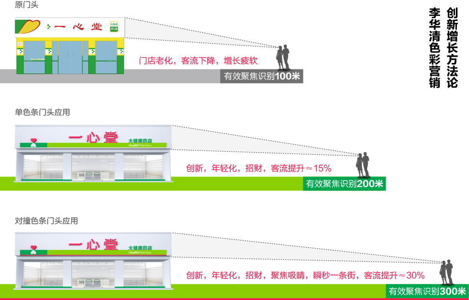讓整條街道都能看到一心堂,實現焦點引流。李華清色彩營銷就具有這樣的魅力。