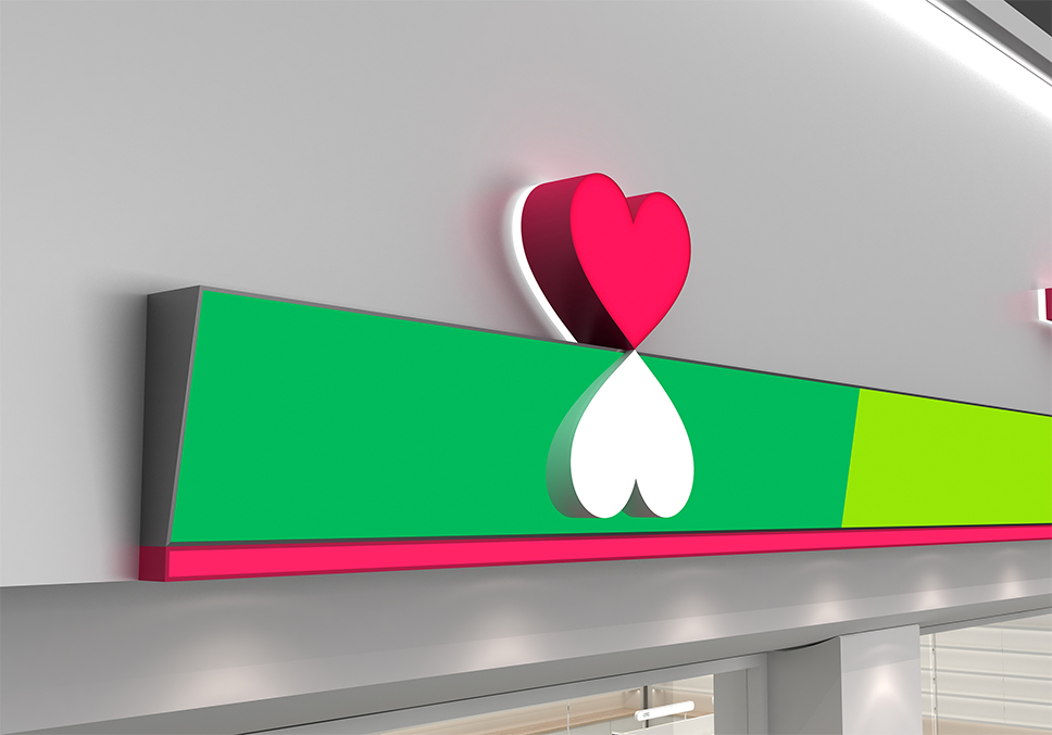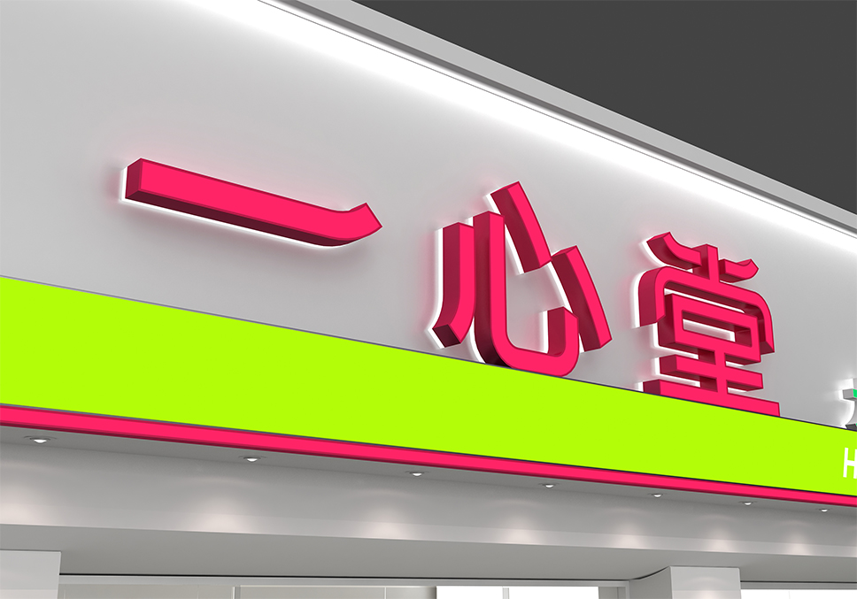 在云南,一心堂明亮的綠色早就融入了百姓的生活。雖然消費者與員工都覺得現在的色彩沉悶而壓抑,但門店中應用的綠色和紅色的品牌名稱,已經形成了品牌的資產,是消費者對一心堂的印象與最大辨識點。于是我們決定保留這一份情懷與認知,在門頭依舊使用綠色和紅色,同時放大品牌名稱。讓老顧客不感到陌生,能迅速識別,讓新顧客看到,走進門店。