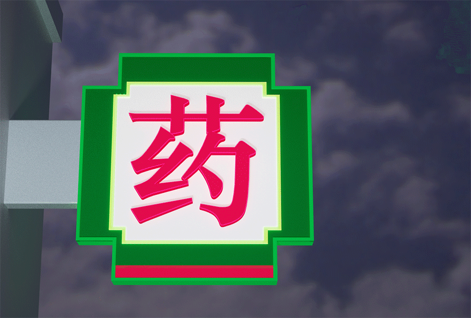 根據色條的視覺引導,順著品牌名稱讀下去,就看到了[大健康藥店],我們可以迅速判斷這家店是買什么的。同時,我們制作了[藥]的燈箱,讓從側面走來的顧客也能快速看到并識別這家店的屬性。
