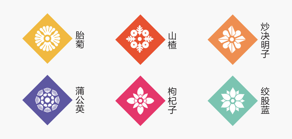 李華清項目團隊在市場走訪中看到了中醫抓方配伍的場景,由此產生了靈感的聯想。我們運用方勝紋與十字穿環紋結合衍生出抓方配伍場景凌霄花、茱萸花、柿蒂紋與產品進行搭配,實現君臣佐使,和諧配伍。通過簡單有序的元素排列,形成專屬的仲景花茶戰略元素。