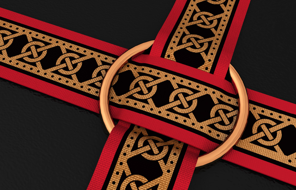 李華清項目團隊將“十字穿環”立體化,把時間與空間的概念置于其中。承載著十字穿環紋樣的絲帶相互疊加,穿過象征著“璧”的金環。